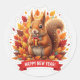 Cute realistic squirrel holding a tiny gift or nut, surrounded by colorful autumn leaves and sparkling confetti. Bright, photorealistic, and festive Happy New Year sticker