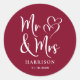 Un pegatina rojo burdeos de moda para su correspondencia boda y favores del partido presentando "Sr. y Sra." escrito en un gran guión blanco y un ilustracion blanco de dos corazones se unieron. Agregue su nombre y fecha de boda.