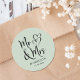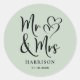 Un pegatina verde sabio de la moda para su correspondencia boda y favores del partido presentando "Mr & Mrs." en un guión elegante y un ilustracion de dos corazones se unieron. Agregue su nombre y fecha de boda.