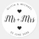 Un Pegatina clásico de la etiqueta de favores de la boda negra que presenta "Mr & Mrs." en una moderna y rústica caligrafía de tipografía elegante y acentos cardíacos. Puede personalizarlo fácilmente con sus nombres y fecha de boda.