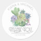 Las fuentes únicas, los suculentos coloridos coloridos coloridos y los fondos purpurinoso en un verde suave primavera son los puntos fuertes de estos productos bodas de mezcla y coincidencia. Este hermoso pegatina tiene un texto opcional de 'Gracias' junto con una plantilla para editar las iniciales de la novia y el novio, un mensaje personal y la fecha de su boda. Busque ID515 para ver todos los productos coincidentes de este conjunto.