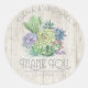 Las fuentes únicas, los coloridos suculentos acuarelas y los rústicos fondos de madera de madera son los puntos fuertes de estos productos bodas de mezcla y coincidencia. Este hermoso pegatina tiene un texto opcional de 'Gracias' junto con una plantilla para editar las iniciales de la novia y el novio, un mensaje personal y la fecha de su boda. Busque ID515 para ver todos los productos coincidentes de este conjunto.