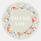 Elegante y boda de moda pegatina con hermosa corona de mandarina y texto "Gracias". Ilustracion botánico floral con flores delicadas de primavera, ramas florecientes y cítricos. Los colores verde gris pastel y naranja.