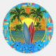 Hermosa puesta de sol en la playa detrás de tablas de surf y palmeras, enmarcada con flores de bambú e hibisco. Con un patrón de fondo de tablas de surf retro.