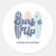 Surf's Up! sube a la playa pegatina invitado por el cumpleaños en azul marino y azul claro.