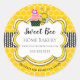 © 2021 Socialite Designs Inc. Plantilla pegatina de diseño de abejas y pasteles de miel. El fondo del diseño tiene un fondo vibrante de patrón de abeja amarillo, una cinta negra de polka-punto y un elegante cartel de texto para tu texto.