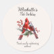Hermosos cardenales rojos y bayas en sellos adhesivos de sobre o bolsa de favores de "Gracias" de cumpleaños número 75 de invierno nevado, personalizados con el nombre de la homenajeada y su edad, junto con un mensaje de "Gracias por celebrar con nosotros". Contacte conmigo para obtener ayuda con sus personalizaciones o para solicitar productos Zazzle adicionales que coincidan o coordinen con su celebración.