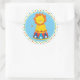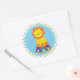 Este pegatina con temática circense presenta con un fondo azul rodeado de una repetición de estrellas rojas, azules, amarillas y verdes. Un lindo león personalizado se sienta en un pedastal en medio del pegatina. Este diseño es parte de mi colección de "Fiesta de cumpleaños temática del circo". Imágenes prediseñadas por Prettygrafik design etsy.com/shop/Prettygrafikdesign