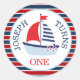 Cuto tema náutico niño primer cumpleaños pegatinas personalizados con velero, con marco blanco, marina y fondo rayado rojo. Personalice el texto usted mismo cuando solicite