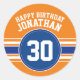 Naranja y azul - Este diseño masculino incluye franjas jersey y colores de equipo. El estilo moderno y elegante es perfecto para cualquier atleta que celebre un cumpleaños. La temática deportiva general se puede utilizar para los amantes del hockey, el fútbol, el fútbol o el béisbol. Cambias los números a tu edad especial para una celebración de cumpleaños.