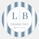 This Classic Round Sticker features a clean and elegant design with alternating blue stripes framing the center. The layout is simple yet sophisticated, creating a balanced composition that highlights the initials "LB" in bold, uppercase letters. Below the initials, the phrase "Thank You" is elegantly inscribed, adding a touch of gratitude to the overall aesthetic. Perfect for personalizing gifts or expressing appreciation, this sticker combines a professional look with a heartfelt message, making it ideal for various occasions such as weddings, baby showers, or corporate events.