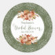 Con flores de acuarela en tono melocotón rústico bohemio y un borde de filigrana de encaje verde salvia, estas hermosas pegatinas redondas clásicas de desayuno nupcial floral se pueden personalizar con el nombre de la novia y la fecha de su desayuno.