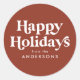 Pegatinas navideñas sencillas con la leyenda "Felices Fiestas" mostradas en letras estilo retro blancas con un fondo marrón terracota. Personalice las pegatinas navideñas de terracota con su nombre o texto personalizado. Las pegatinas navideñas elegantes son perfectas para usar en sellos de sobres, envolturas de regalos, favores de fiesta y más. Diseñadas para coordinar con nuestra colección de tipografía retro de fiestas.