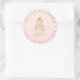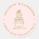 Un pegatina de empaque limpio, profesional y moderno para diseñadores de pasteles y estilistas de postres. Este diseño presenta una caprichosa imagen dibujada a mano de una torta de tres niveles en el centro con un oro falso, y detalles de negocios en oro falso en una disposición circular, con un fondo rosa rubor.