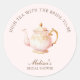 Pegatina redonda elegante para desayuno nupcial con ilustración de tetera pastel con acentos dorados, combinada con fuentes serif y script en las que se escribe la información personalizada. Consulta nuestra tienda para ver más artículos de esta colección.