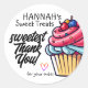 Este es un pegatina de Gracias con un quequito rosado y cerezas en la parte superior. Esto puede ser utilizado por pequeñas empresas en sus productos comprados por sus clientes.