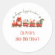 All aboard for festive fun with this adorable Christmas train birthday sticker, perfect for adding a cheerful touch to your little one’s holiday celebration! Featuring a “Chugga Chugga Two Two” Santa train design in classic red, green, and gold tones, this round sticker showcases Santa leading a charming Christmas train filled with gifts, toys, and festive friends. Beneath the illustration, customizable text allows you to personalize it with your child’s name, age, or special message for a truly unique party detail. Ideal for sealing envelopes, decorating party favors, or adding to treat bags and gift boxes, this sticker brings a playful and heartwarming holiday touch to any kids’ Christmas birthday theme. With its whimsical watercolor artwork and joyful seasonal design, it’s a delightful way to tie together your festive celebration and make every detail feel merry, magical, and personalized just for your little conductor’s big day.