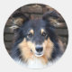 Beatuita tricolor Sheltie o Shetland Sheepdog cara en un pegatina de ladrillo de color que adoraba al perro