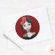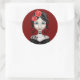 Este diseño único presenta una chica de aspecto triste con dos rosas rojas en el pelo. Los grandes ojos azules y la pequeña boca le dan al diseño un aspecto muy elegante y hermoso. Se pueden ver extraños de pelo largo y negro fluyendo desde la cabeza de los chicas hacia la piel pálida y blanca en su pecho. Tres rosas tribales negros con hojas y líneas giratorias se tatuan en el hombro de los chicas, lo que hace eco de las flores en su pelo.