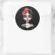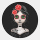 Este diseño único presenta una chica de aspecto triste con dos rosas rojas en el pelo. Los grandes ojos verdes y la pequeña boca cosida le confieren al diseño un aspecto muy elegante y hermoso. Se pueden ver extraños de pelo largo y negro fluyendo desde la cabeza de los chicas hacia la piel pálida y blanca en su pecho. Los ojos de los chicas están rodeados de grandes círculos negros y simples pedales de flores al estilo de los cráneos azucareros del Día de los Muertos. Tres rosas tribales negros con hojas y líneas giratorias se tatuan en el hombro de los chicas, lo que hace eco de las flores en su pelo.