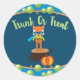 Entrega algunos pegatinas de Tronco o Trato en tu próximo evento de Tronco o Trate. El diseño es colorido y juvenil, con un zorro superhéroe con capa sobre el tronco de un árbol.