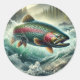 A round sticker featuring a dynamic trout illustration inspired by life in rivers and streams.