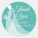 Ducha de novia con traje de palacio elegante de color turquesa, gracias a un pegatina redondo clásico que presenta a una novia con un elegante vestido de boda de encaje sobre un fondo turquesa con un hermoso guión blanco para los detalles especiales de la ducha de novia. Puede personalizar del color de fondo para coordinar con el tema boda.