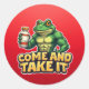 Bring fun and bold energy to your messages with this vibrant green frog sticker! Featuring a muscular cartoon frog holding a clearly labeled "Tylenol" bottle, this sticker combines humor and charm in a playful design. The thick bold outlines and bright colors make it pop on any background, while the catchy text “COME AND TAKE IT” adds attitude and personality. Perfect for digital messaging apps, laptops, water bottles, notebooks, or any surface you want to decorate with a unique, eye-catching sticker. High-resolution PNG with transparent background ensures crisp, clean visuals. Original AI-generated artwork, ready to brighten your day!