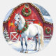 Una pegatina navideña bonito con el ilustracion de un caballo blanco parado frente a un granero rojo magnífico decorado con luces de Navidad y una corona festiva en un día de invierno nevado.