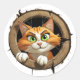 Esta imagen muestra un gato personalizado naranja con ojos verdes brillantes y una expresión alegre y juguetona. El gato está mirando a través de un agujero redondo de madera, mostrando una decoración curiosa y caprichosa. El marco de madera está decorado con grietas y texturas, lo que aporta un toque de realismo, mientras que el diseño general sigue siendo vibrante y lleno de vida