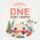Un feliz Chica de Camper Woodland Primer cumpleaños Pegatina redondo clásico rosado