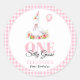 Un tonto ganso y chica de gingham rosado de primer cumpleaños pegatina redondo floral. Este adorable diseño de primer cumpleaños muestra una gallina de oca pintoresca adornada con un gorra de cumpleaños rosado y un arco, todo dentro de un encantador marco blanco redondo. El ganso está encaramado sobre un adorable arreglo floral, con un globo rosa con el número 1 flotando de su cola. La invitación, alegremente, dice "Una gallina de los huevos" y está bordeada por un delicioso patrón de gingham rosa y blanca.