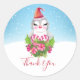 Gracias pegatinas con un diseño tierno y caprichoso que presenta un adorable pingüino con un sombrero rojo de santa. Detrás de un ramo de flores con caramelos de rayas rosas y blancas. Un invierno nevado con copos de nieve cayendo.