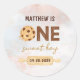 Pegatina redondo clásico de la primera fiesta de cumpleaños de One Sweet Cookie