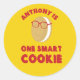 Cree suministros para fiestas personalizados para celebrar su galleta inteligente. Estos pegatinas divertidos son perfectos para las fiestas de graduación. Incluyen el lema "ONE SMART COOKIE" junto con el ilustracion de una elegante galleta de bocadillos de vainilla de aspecto muy estudioso que lleva algunas gafas rojas. Las letras rojas sobresalen sobre un fondo amarillo soleado.