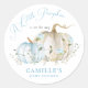 Una elegante pegatina redonda de ducha de bebé diseñada con calabazas de acuarela azules y blancas. La mayoría de las letras son editables: haga clic en el botón "Personalizar más" para editar. Artículos coincidentes en nuestro diseño de fiesta Cava