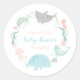 Este pegatina de ducha con temática marina incluye una ballena, tiburón tigre, gelatina, tortuga marina y caballitos de mar, todos nadando en círculo con hierba marina y conchas.
