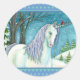 PEGATINA REDONDA UNICORN INVIERNO Y AVES, PAISAJE DE NIEVE PACÍFICO