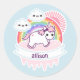 Super lindo bebé unicornio con arco iris y nubes felices. Personaliza con tu propio texto.