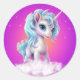 Pegatina Redonda Unicornio sobre cielo rosado/estrellas/nube