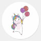 Pegatina Redonda Unicornio vuela con globos sobre unicornios bangla