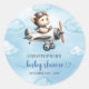 Celebrate your little aviator’s upcoming arrival with this adorable boy baby shower sticker featuring a cute teddy bear pilot flying a vintage airplane. Designed in a charming blue and brown color palette, this aviation-themed sticker adds the perfect touch of sweetness and adventure to any baby shower décor. Use it for favor bags, envelopes, gift packaging, party décor, thank-you tags, or diaper raffle prizes to instantly elevate your event’s theme.