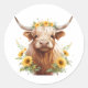 Pegatina Redonda Vaca Highland con la flor amarilla