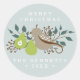 Perfecto para sus tarjetas de vacaciones, invitaciones y regalos, estos pegatinas redondos festivos cuentan con un pájaro perdiz bronceado y un ilustracion de pera verde, flanqueado por la vegetación invernal sobre un fondo verde azul glacial. Personalice con su mensaje personalizado, nombre y año en letras blancas. Diseñado para coincidir con nuestra tarjeta Partridge y Pear y la colección de accesorios.