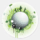Tonos verdes de estilo ondulante, diseño de golf, con una pelota de golf en la cara con palas y hojas alrededor y golfistas con bolsos de golf en la mano, parados en la superficie del balón de golf, con banderas de golf pegadas.