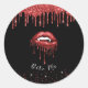 Pegatina redonda de los labios y colmillos de vampiros de Halloween editables. El diseño presenta labios rojos goteando con sangre y colmillos de vampiros sobre un fondo negro! El purpurina rojo glamuroso y los destellos decoran la mitad inferior del pegatina. Personalice el texto y cambie el estilo de fuente y el color a la medida. Reposicionar y eliminar el texto mediante la herramienta de diseño, si es necesario. El purpurina no es un purpurina "real" sino un efecto impreso.
