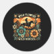 Pegatina Redonda Vaquera al atardecer montando flores silvestres de