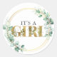 Verde Es una niña Eucalipto Cumpleaños Pegatina redonda clásica. Con hojas de eucalipto de acuarela, un marco redondo dorado y un texto NIÑA en lámina dorada.