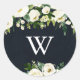 Este pegatina redondo clásico de boda monograma azul real floral verde es perfecto para un boda rústico. El diseño presenta elegantes peonías blancas acuarelas con follaje verde en un fondo azul oscuro. Personalice las etiquetas con la última inicial de la novia y el novio.