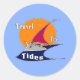 Impresionante diseño divertido que representa un velero navegando por las mareas del océano, con el sol en el fondo. Un estilo de vida oceánico aventurero.